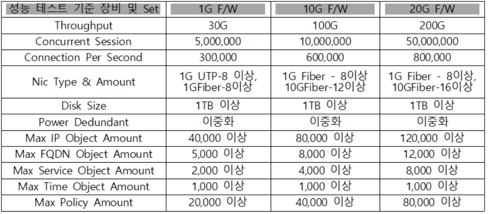 - 다 음 - 1. 개요 시중 방화벽 최신 제품의 기능 및 성능 검증을 통해 당사 필수 요청 사항을 만족하는 제품을 선정하여 IT 표준에 등록하고자 함 2. 방화벽 BMT 평가부문 가. 평가대상 : 요구되는 기능 및 성능을 보유한 방화벽(1G 10G 20G 각각) 나. 기술평가 : 방화벽 제품군에 대한 기능 평가(1G 10G 20G 공통) 다. 성능평가 : 각 방화벽 제품군에 대한 throughput 포함 성능평가 3. 내용 가. 접수기간 : 2025년 10월 01일(수) 18시까지(기일 및 시간 준수 바람) * 시간 미준수 시 불참으로 간주함 나. 접수방법 : 담당자에게 참여 여부 메일로 송부 및 제출서류는 설명회 당일 제출 다. 업체 참여자격 요건 1) 위의 2번 항의 기술 및 기능을 모두 만족하는 솔루션 납품 가능 업체 2) BMT 실시를 위한 기기 및 인력지원 가능 업체 - 참여업체는 장비 솔루션 인력을 BMT 기간 동안 무상제공 하여야하며 전원 공사가 필요한 경우 업체에서 비용을 부담하여야 함. - 계측기는 당사 지정 업체로 지정하며 사용 비용은 참여업체에서 부담 3) 참여제품에 대한 금융 공공 기업에 방화벽 장비 납품 및 구축 실적을 보유한 업체(납품실적 증명자료 제출 필수) 4) 공고일 현재 우리금융그룹으로부터 부적격업체로 제재를 받고있지 아니한 업체 라. 제출 서류 1) BMT 참여 의뢰 공문(제품명 본문에 표기) 1부 2) 참여 솔루션(H/W S/W) 사양서(상세 CC 및 CPS 포함) 납품실적 증명 자료 담당자 연락처/메일주소 1부 마. 기타 사항 1) 사전설명회 개최 : 2025년 10월 02일 (목) 10:00 ~ 11:30 1.5시간 우리금융상암센터 BPR센터 3층 IT교육장 * 각 업체별 3명 이내 참석 가능 2) BMT 실시 및 평가 : 2025년 10월 13일 ~ 17일 (참여업체 수에 따라 일정 조정 예정) 바. 방화벽 기준 Spec 및 평가 네트워크 구성 1) 방화벽 기준 Spec 정보